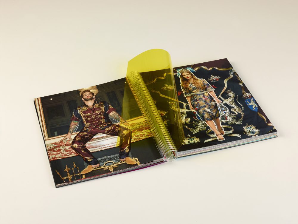 Davanti alla prima di coperta, in corrispondenza del logo DG, un filtro fotografico magenta in formato 21,6×14, crea un gioco di colori con il logo dello stilista.